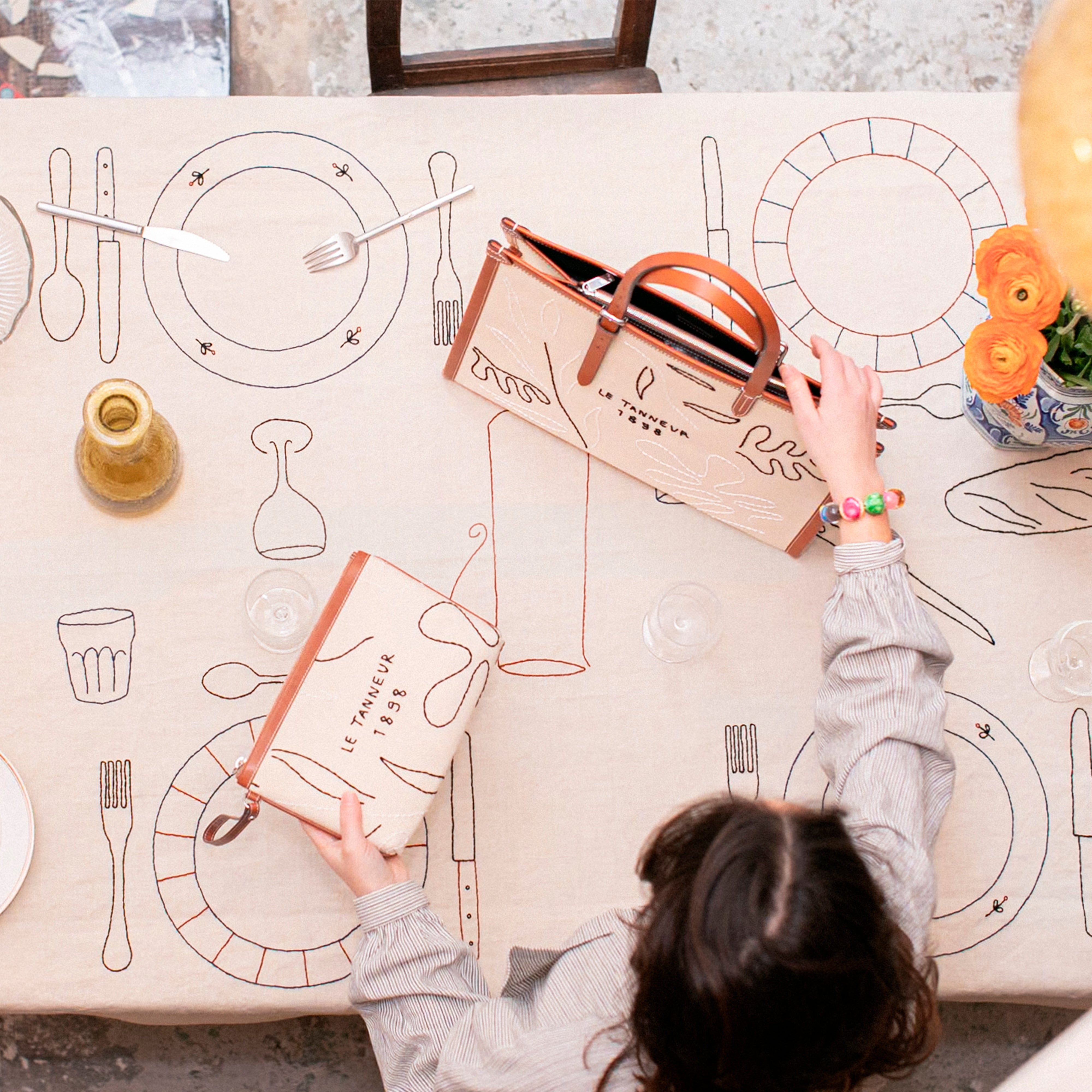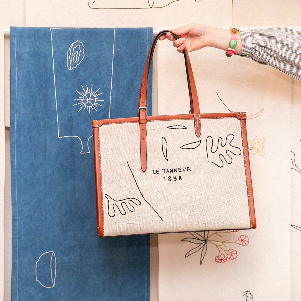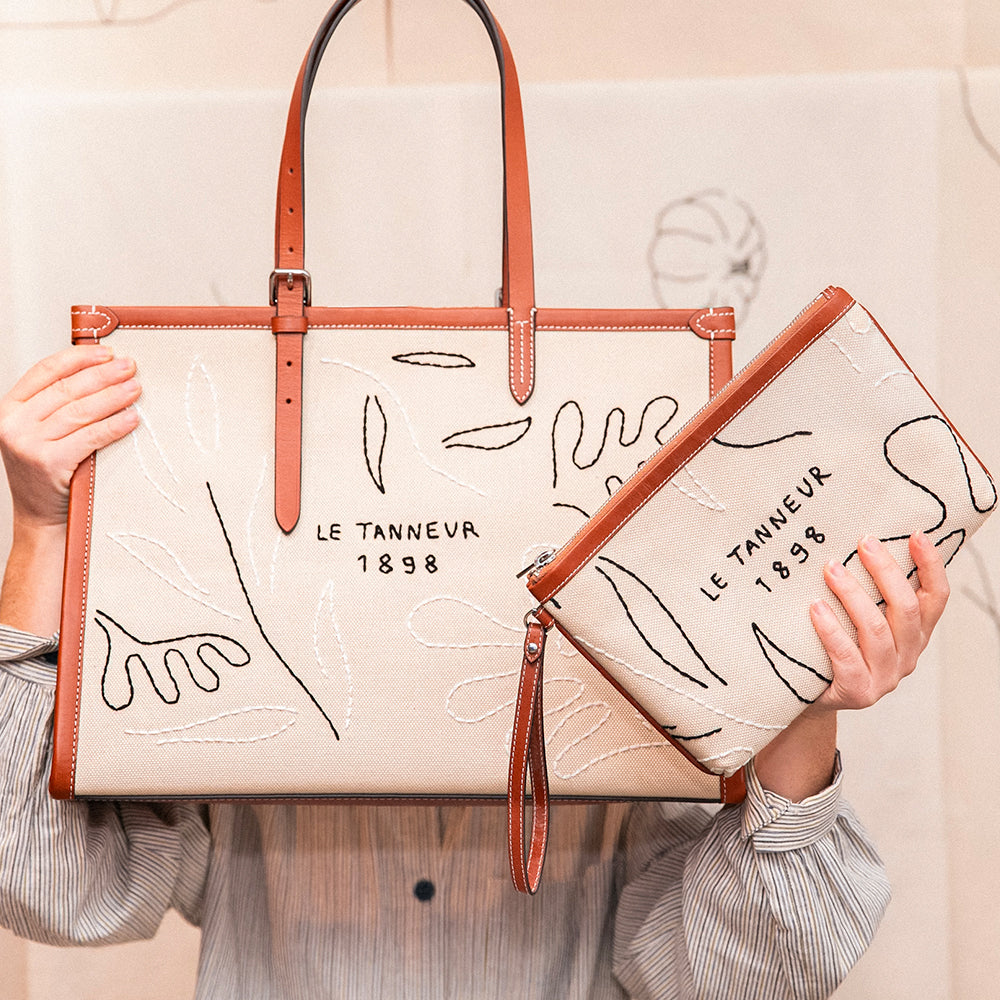 Après le succès de notre première collaboration, une série de nappes inspirées par la Méditerranée, l’artiste-designer marseillaise nous dévoile cette fois l’étendue de son talent à travers deux pièces en toile et cuir : un sac cabas 125 et une pochette, deux pièces brodées mêlant douceur estivale et belles matières.