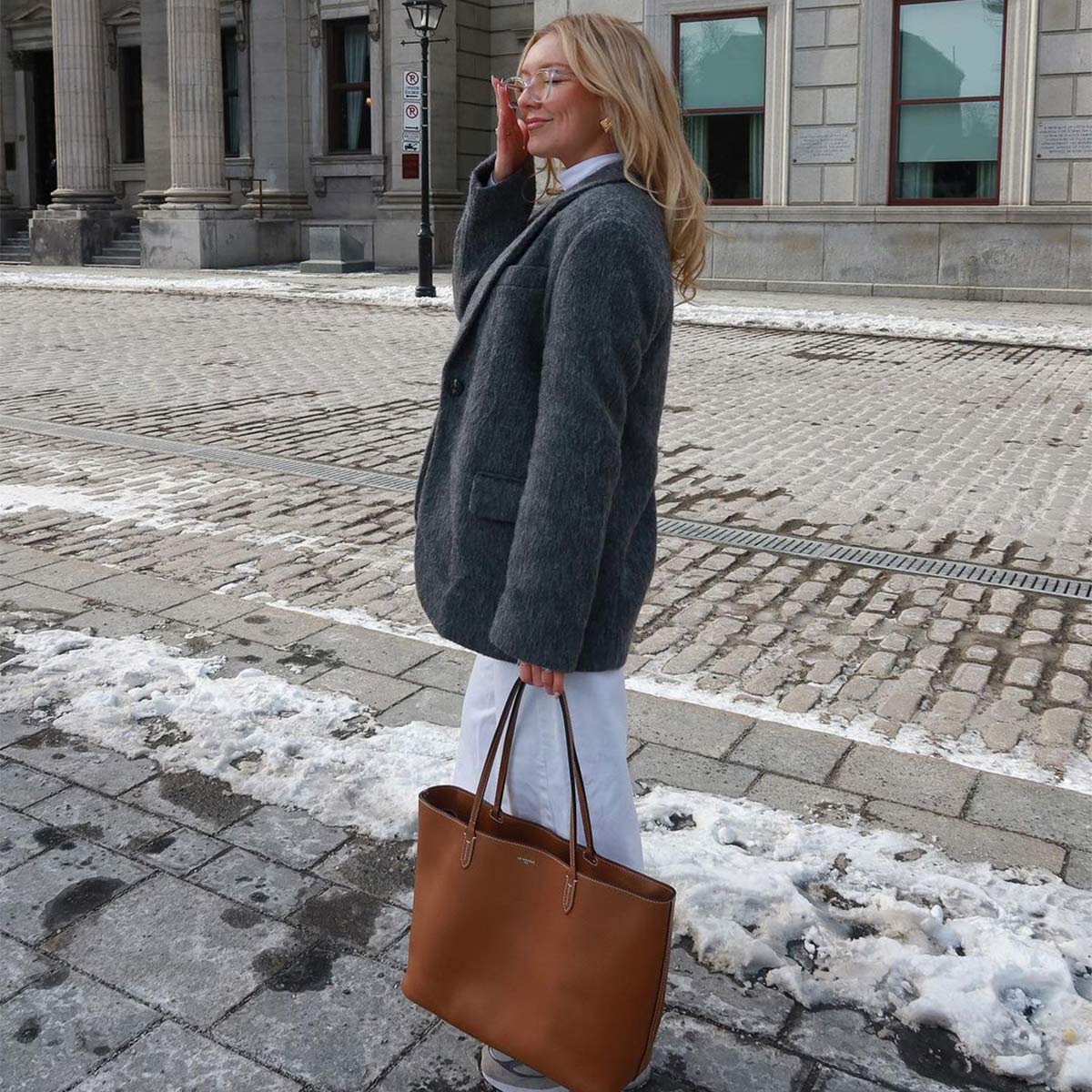 Grand sac cabas zippé en cuir grainé double face intérieur contrasté et pochette amovible. Porté épaule. Peut contenir un ordinateur 16".