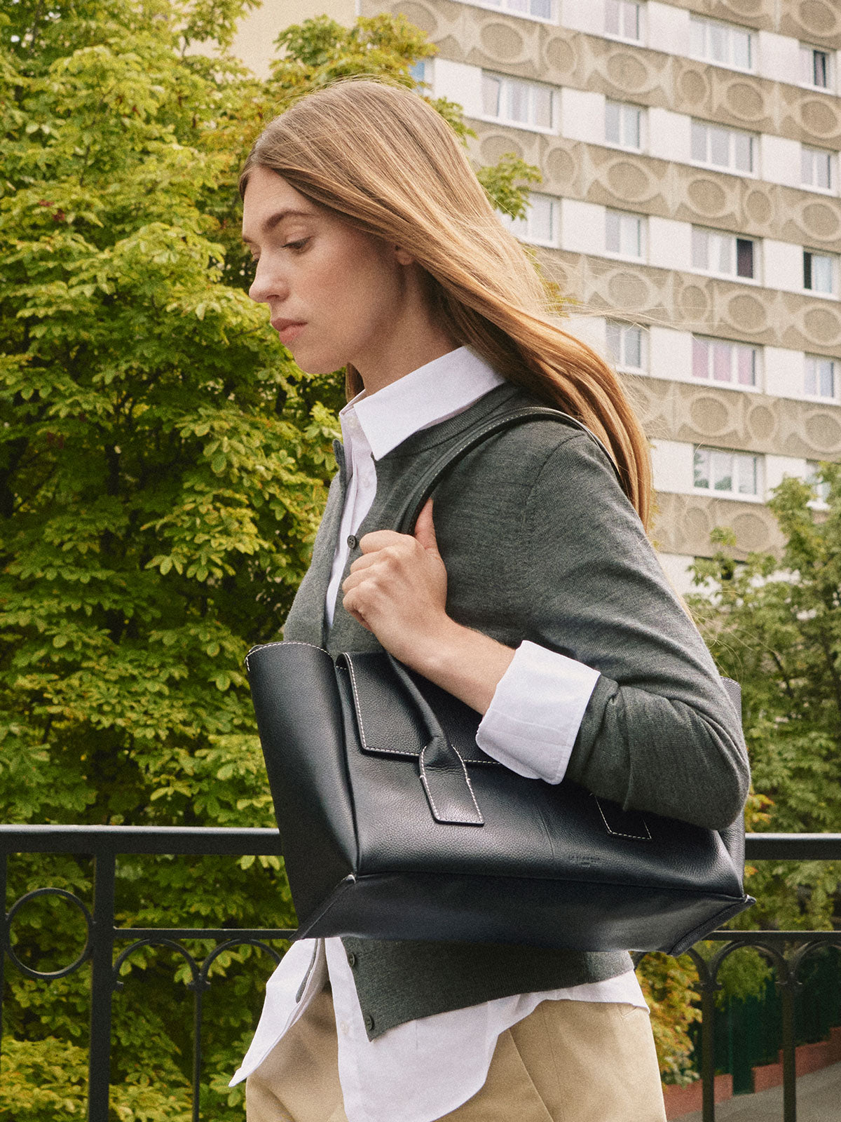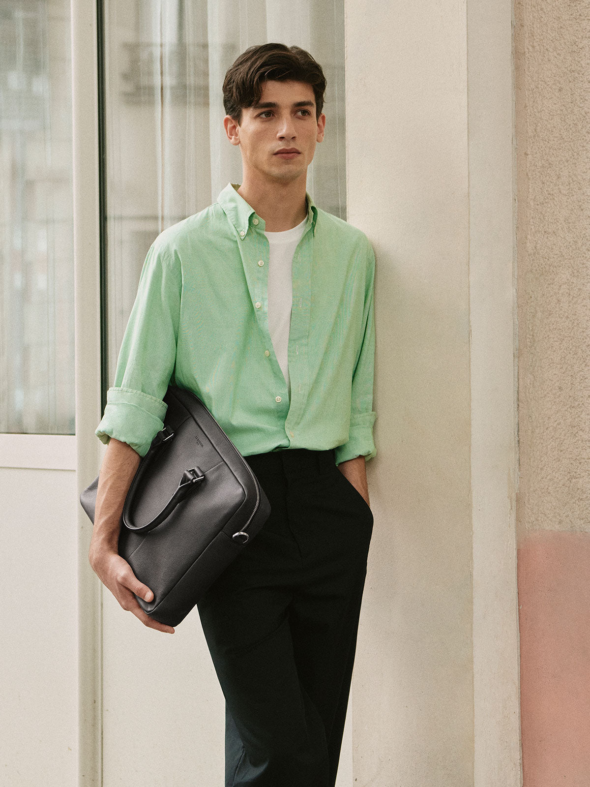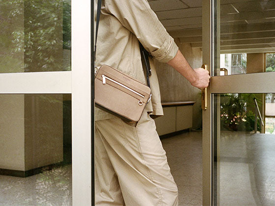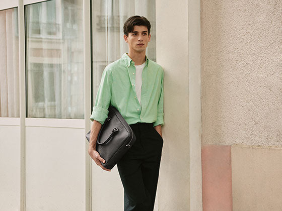 Ce traitement léger permet de révéler toute la finesse du cuir, en conservant sa densité et sa structure naturelle. Le rendu est élégant, épuré, avec un léger éclat qui capte subtilement la lumière. Chaque pièce en cuir lisse incarne ainsi une esthétique pure et minimaliste, qui met en valeur la silhouette du sac et la précision de sa fabrication.