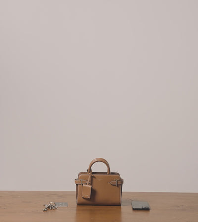Sac à main mini modèle avec double T métallique signature et charms amovible. Marquage Le Tanneur sur film argenté clair. Porté main, épaule ou croisé grâce à sa bandoulière ajustable et amovible.