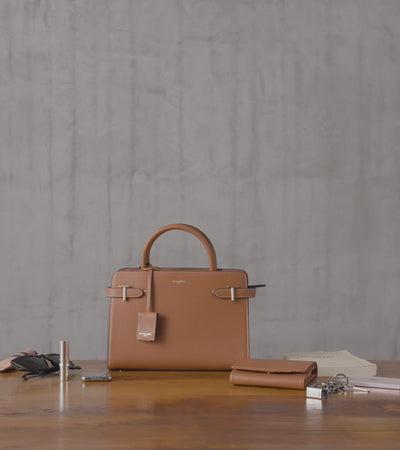 Sac à main moyen modèle avec poignées toron et trois compartiments dont un zippé. Pièces T métalliques signature de la ligne. Charms embossé Le Tanneur amovible. Porté main, épaule ou croisé grâce à sa bandoulière ajustable et amovible.